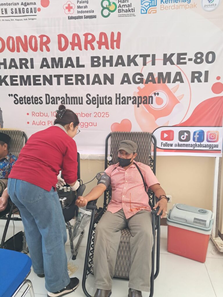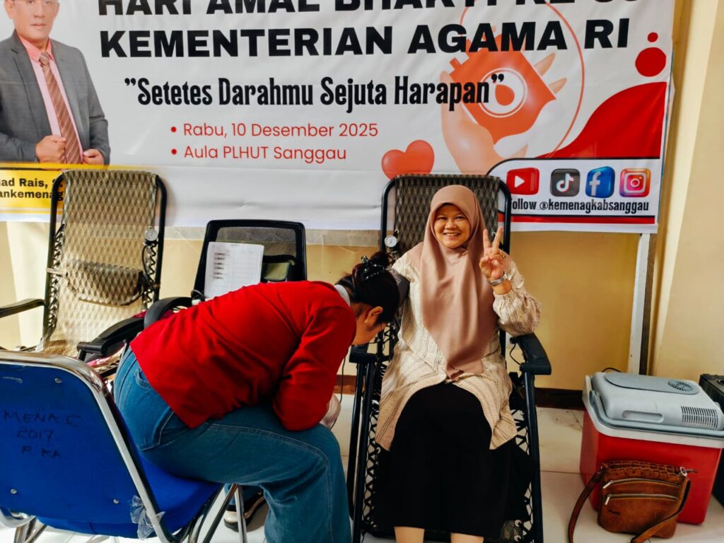 Sanggau — Kepala Madrasah dan guru MTsN 1 Sanggau menunjukkan kepedulian sosial dan semangat pengabdian dengan berpartisipasi dalam kegiatan donor darah yang digelar di Kantor Kementerian Agama Kabupaten Sanggau, Rabu (10/12/2025), dalam rangka memperingati Hari Amal Bhakti (HAB) ke-80 Kementerian Agama Republik Indonesia. Kegiatan kemanusiaan yang mengusung tema “Setetes Darahmu, Sejuta Harapan” ini menjadi salah satu rangkaian program bakti sosial Kemenag yang bertujuan menumbuhkan solidaritas, memperkuat empati sosial, serta meningkatkan kesadaran ASN dan pegawai terhadap pentingnya membantu sesama melalui aksi nyata. Kegiatan donor darah tersebut dipantau langsung oleh Kepala Kantor Kementerian Agama Kabupaten Sanggau, Mad Rais, yang hadir meninjau jalannya kegiatan sekaligus memberikan motivasi kepada para peserta. Ia menyampaikan apresiasi atas partisipasi aktif para kepala madrasah, guru, dan pegawai yang telah meluangkan waktu dan tenaga untuk mendukung kegiatan kemanusiaan ini. Kegiatan donor darah bukan hanya bagian dari peringatan seremonial HAB, melainkan bentuk pengamalan nilai-nilai pengabdian dan pelayanan kepada masyarakat yang menjadi ruh Kementerian Agama.