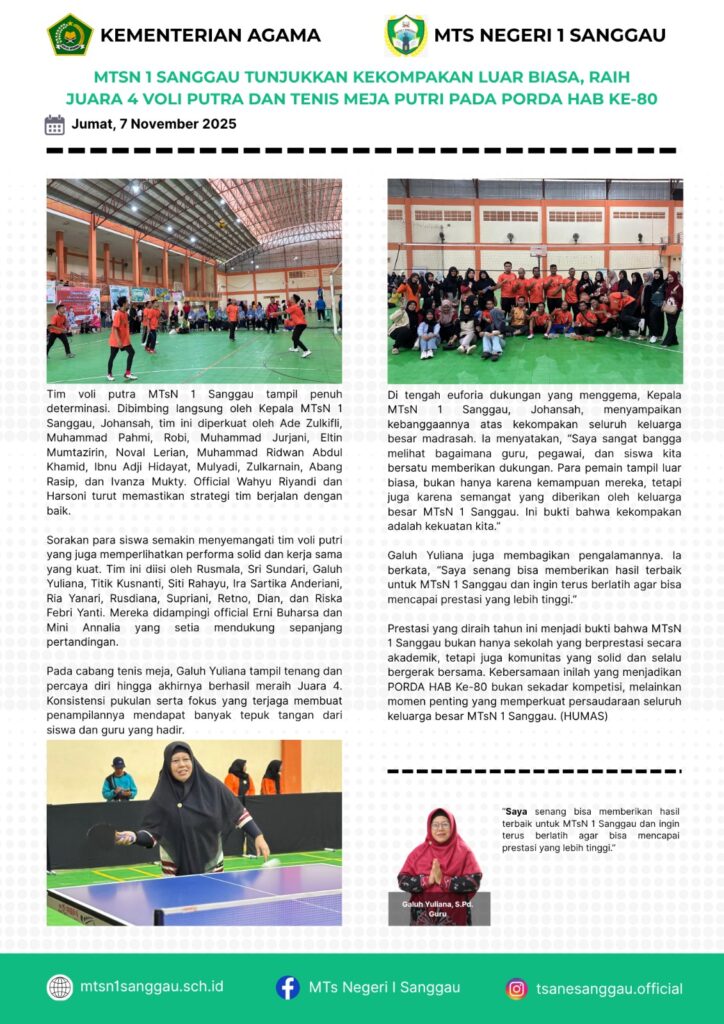 MTSN 1 SANGGAU TUNJUKKAN KEKOMPAKAN LUAR BIASA,RAIH JUARA 4 VOLI PUTRA DAN TENIS MEJA PUTRI PADA PORDA HAB KE-80